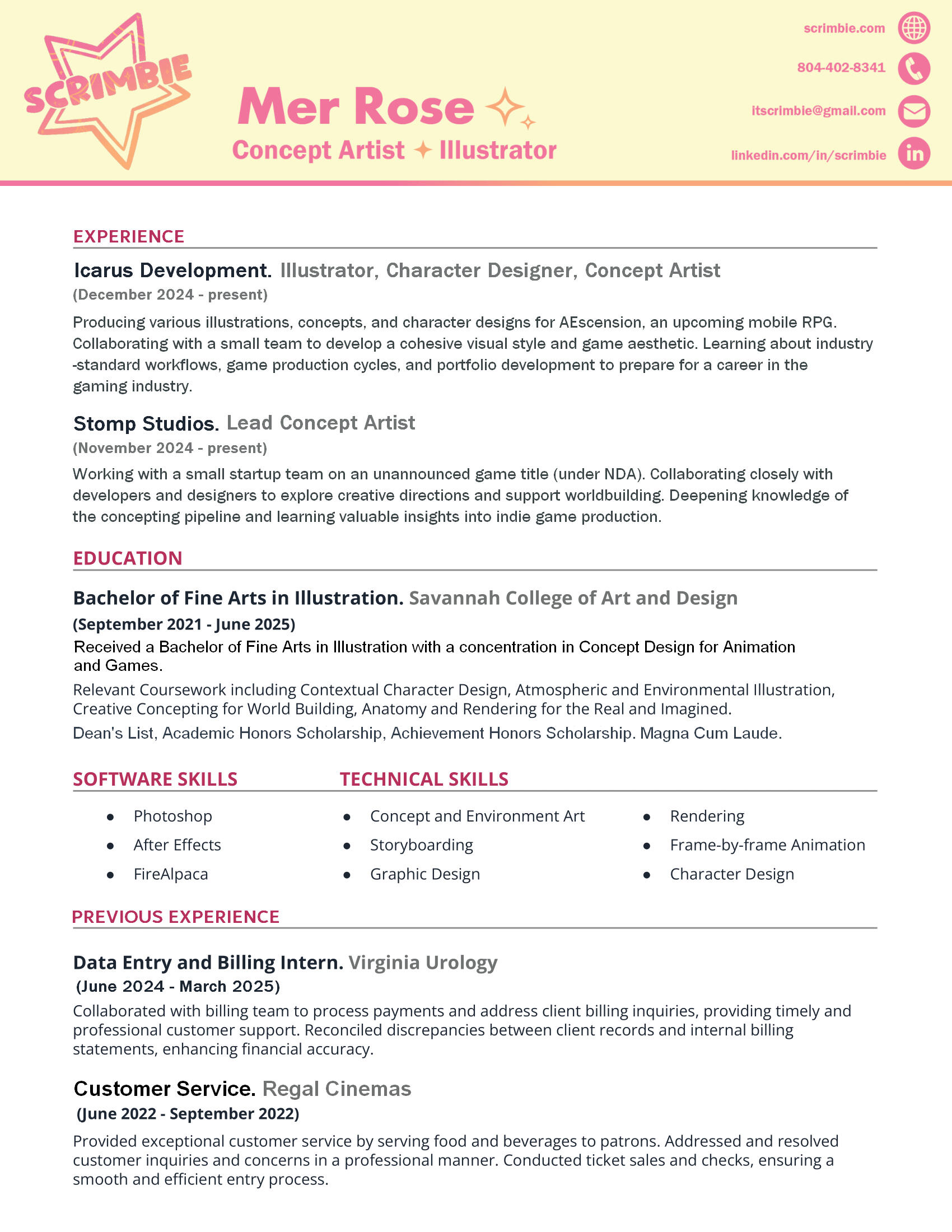 The Savannah College of Art and Design has honed my passion for concept design, where I graduated with a Bachelor of Fine Arts degree in illustration in 2025, with Magna Cum Laude. My journey into the art world has been a constant source of joy and inspiration!